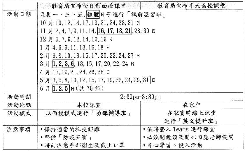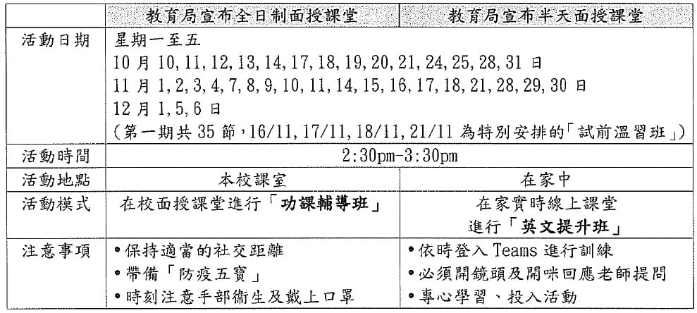 本年度學校與創意思維發展協會有限公司合作舉辦區本課後功課輔導班(免費功課輔導班,供合資格學童申請)及與恩慈社會服務中心有限公司合作舉辦校本課後功課輔導班(收費),於上課日放學後以小組形式為參加學生進行功課輔導,由外聘兼職導師負責。鑒於疫情仍未完全受控,現階段功課輔導班改為以線上模式進行「英文提升班」。各項功輔班資料詳列如下: