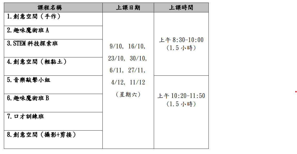 本校與【創意思維發展協會】合作,為有需要的學生提供免費的興趣班,以提昇他們的學習效能、擴闊他們在課堂以外的學習經驗,並增強他們對社會的認識和歸屬感,以達致全人均衡發展。興趣班包括:「創意空間(手作)、創意空間(黏土)》、創意空間(攝影+剪接)、魔術A班、魔術B班、口才訓練、音樂敲擊、STEM科技探索,另外會舉辦三項戶外活動學習。